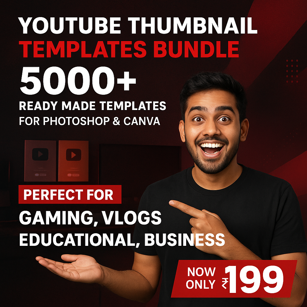 Aapko milte hain 5000+ professionally designed YouTube Thumbnail Templates — Canva & Photoshop dono formats me. Har niche ke liye ready-made templates — Gaming, Vlogs, Education, Business, Motivation, etc